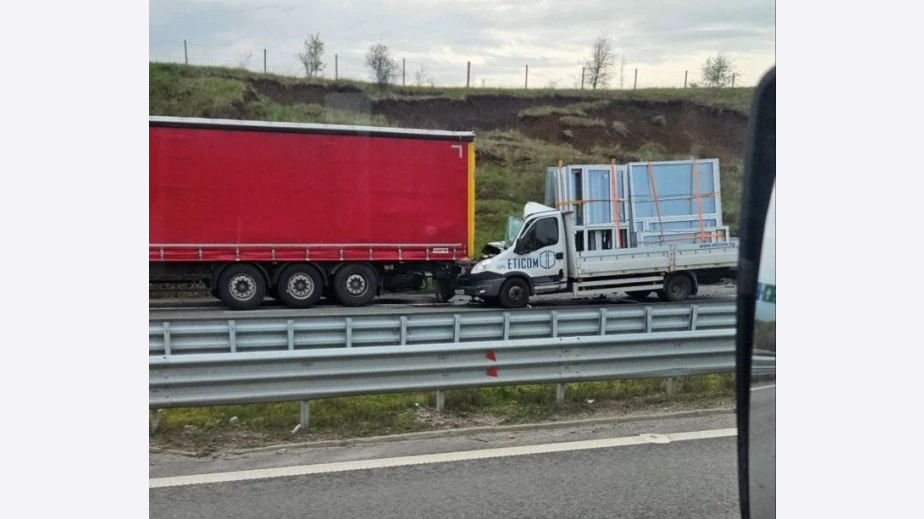 Малък камион, превозващ дограма, се е ударил отзад в тир. Няма информация за пострадали при инцидента. На място има полиция, която регулира движението.