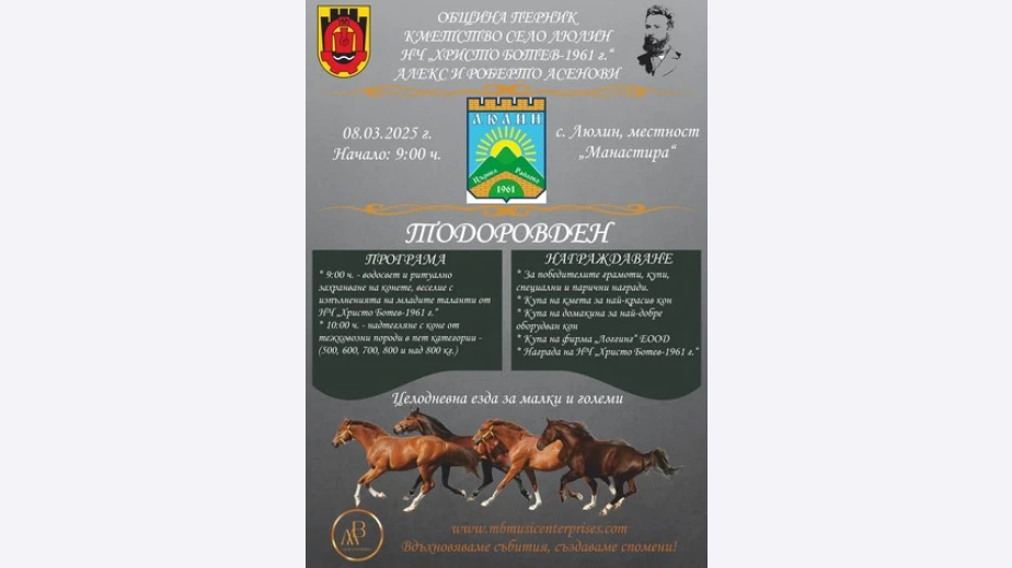 Тазгодишното издание на конския Великден съвпада с международния ден на жената. Празничният 8-ми март ще започнес пъстра фолклорна програма в 9:00 ч. с изпълнения на самодейци от Народночиталище „Христо Ботев-1961 г.“, село Люлин, с водосвет и ритуално захранване на конете, както повелява обичаят.
