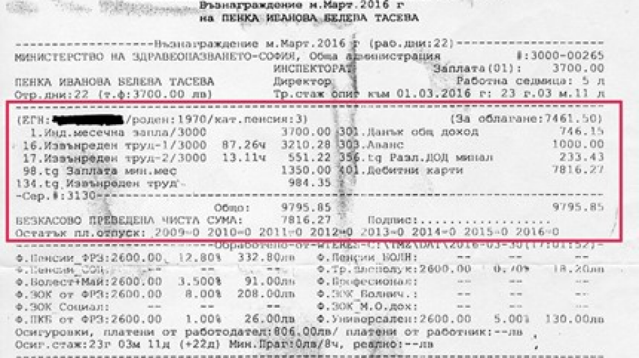 За март Белева е изработила над 100 часа извънреден труд и е начислено възнаграждение от 9795,85 лв., става ясно от фиш за заплатата й, с който „Труд“ разполага. Индивидуалната месечна заплата вписана във фиша е 3 700 лв. , към тях са добавени и още 1350 лв. за минал месец. Нанесени са и три графи за извънреден труд – първата за 87,27 часа – 3210 лв., втората за 13,11 часа – 551 лв. и още 984 лв.