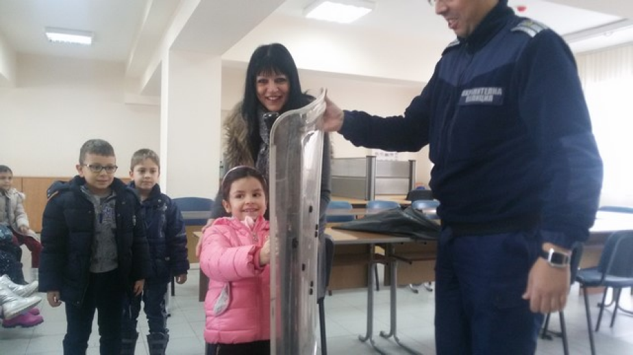 С голям интерес малките посетители се запознаха с помощните средства, използвани от служителите на реда. Палките, белезниците, бронежилетките, щитовете и каските ги впечатлиха неимоверно и голяма част от тях пожелаха да ги сложат на телата си.