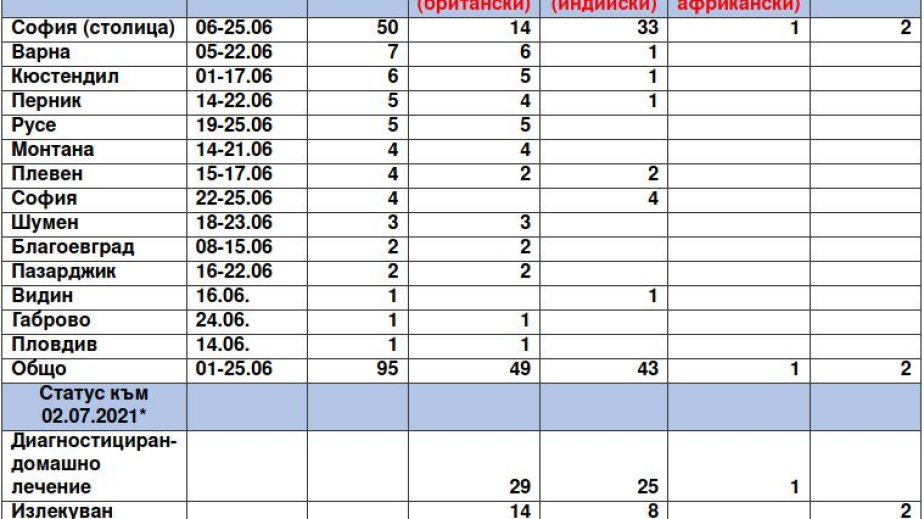 Пробите са взети от пациенти с COVID-19 в периода 01-25 юни 2021 г. и са от 14 области на страната. В Перник е засечен 1 случай. Той е регистриран в периода 14-22 юни. Установени са и 4 случая на британския щам. Най-много заразени с индийския вариант са засечени в столицата - 33.