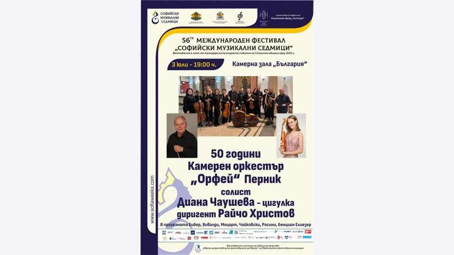 На 3 юли (сряда) от 19:00 ч. в Камерна зала „България"– София, Камерен оркестър „Орфей" ще отпразнува своята 50-годишнина с тържествен юбилеен концерт. Под диригентството на неговия основател и маестро Райчо Христов и със специалното участие на изключително талантливата и нежна цигуларка Диана Чаушева. Програмата ще представи музикално пътешествие през епохи и стилове – от барока до съвременността.