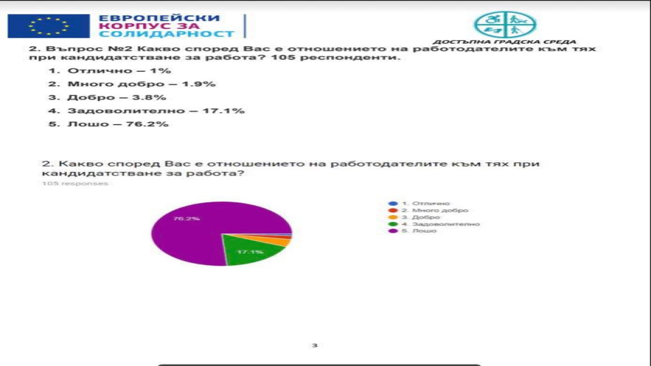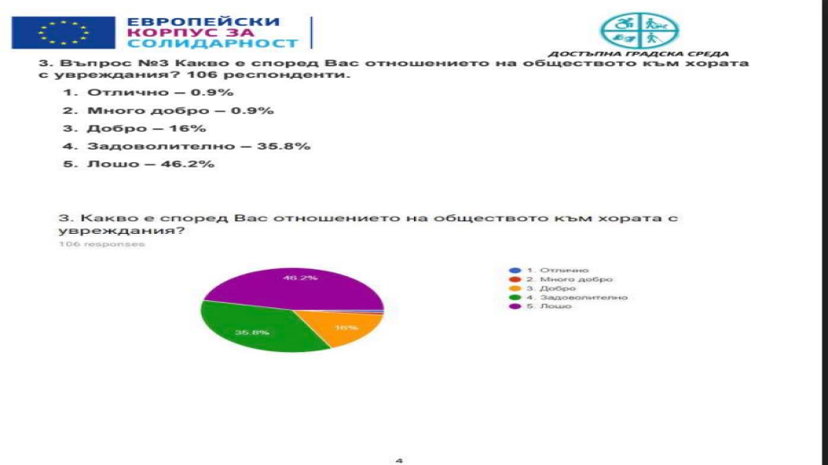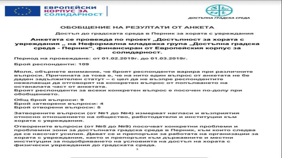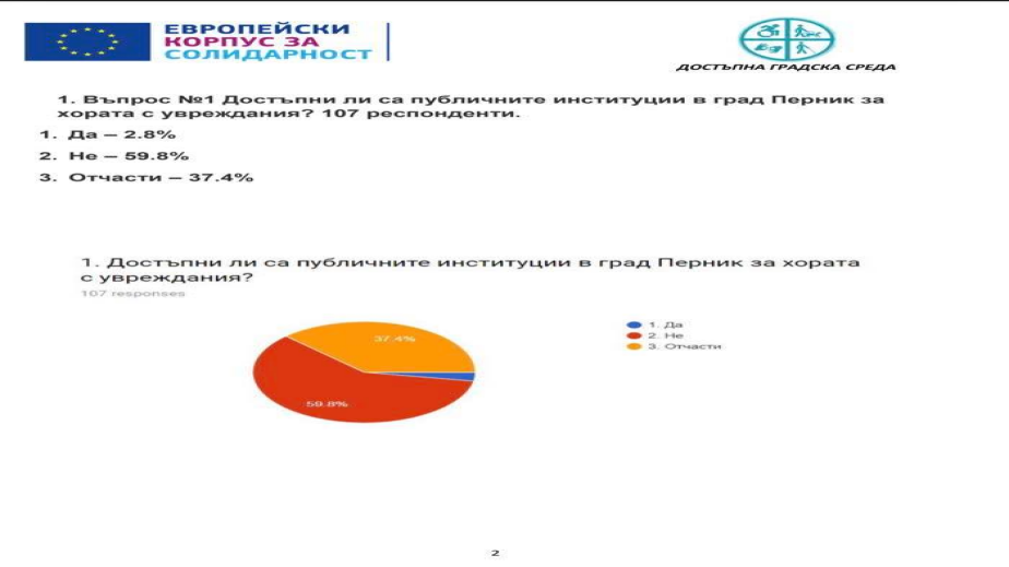 Затворените въпроси измерват нагласи и възприятия относно отношението на общество, работодатели и институции към хората с увреждания. Резултатите показват например, че през 2019 г. в европейска България 59,8% от анкетираните смятат публичните институции в град Перник за недостъпни за хората с увреждания.