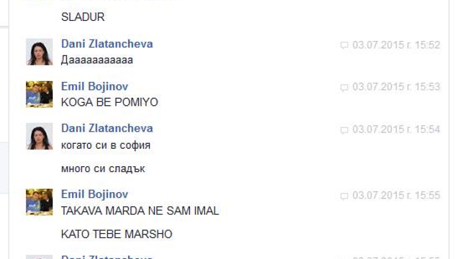 "Представям ви бащата на Повелителя на малките котета, заклет ритнитопковец и почитател на кълчибаджак културата - големия котарак Емил Божинов в любовно обяснение към мен от преди няколко месеца. Публикува се в чест на наближаващия празник на виното и любовта… Истинското лице на един „човек зад кадър”, но с големи претенции да е в играта", написа в профила си журналистката Дани Златанчева, а отдолу публикува и снимки, показващи сексдиалога между тях.