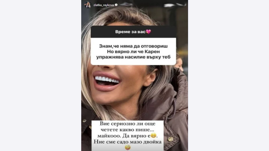 Поводът за актуалното й признание бе провокативен въпрос по време на разговор на Златка с последователите й в Инстаграм - дали Карен, с когото минаха тази година под венчилото, наистина упражнява насилие над нея.