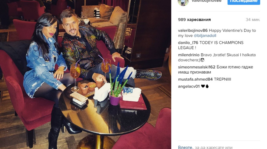 След поредицата клипчета, с които разтресе социалните мрежи, Валери Божинов използва социалните мрежи, за да се обясни в любов на половинката си Биляна. Българинът и любимата му се снимаха в модерен белградски клуб, а половинката му върна жеста и също го поздрави в социалните мрежи./БЛИЦ