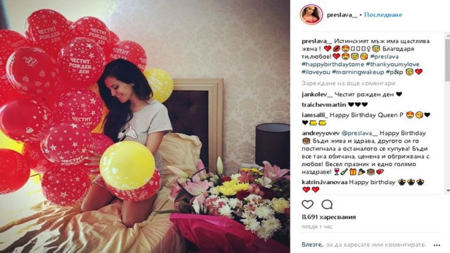 Преслава ще прекара празника в тесен кръг, в прегръдките на любимия си – бизнесменът Павел Лазаров. Той я зарадва още сутринта с 34 балона с надпис „Честит рожден ден“ и огромен букет.
