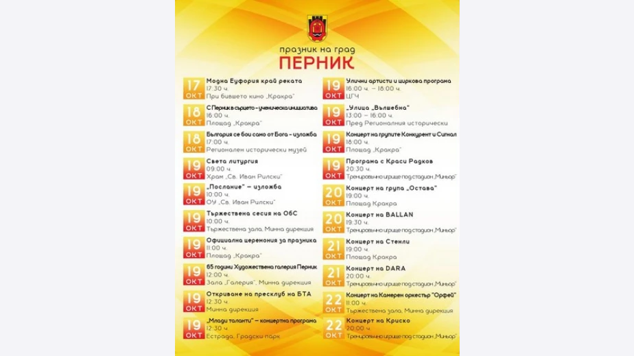 В петък от 19:30 на сцената ще излезе Балан, а в събота и неделя, съответно от 20:00 ч. и 19:00 ч. перничани ще се забавляват с Дара и Криско.