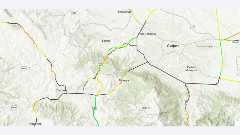 Трасето свързващо Перник с Брезник от своя страна е най-дългото с голям риск според посочената карта. Между миньорския град и Радомир също има зона с червен цвят.