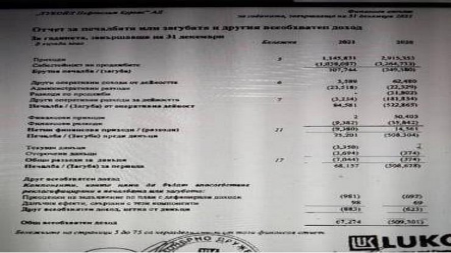 Това е довело до много различна картина както на приходите, така и на разходите, защото суровината вече не се води собственост на компанията. Така приходите на „Лукойл Нефтохим“ за 2021 г. са в размер на 1.1 млрд. лв. при 2.9 млрд. лв. за 2020 г., като приходите от външни пазари са много малки. Много намаляват и разходите - защото няма разходи за суровината. Така разходите падат от 3.5 на 1 млрд. лв. Общият резултат е печалба в края на годината и плащане на данък на държавата. /Източник: Лупа.бг
