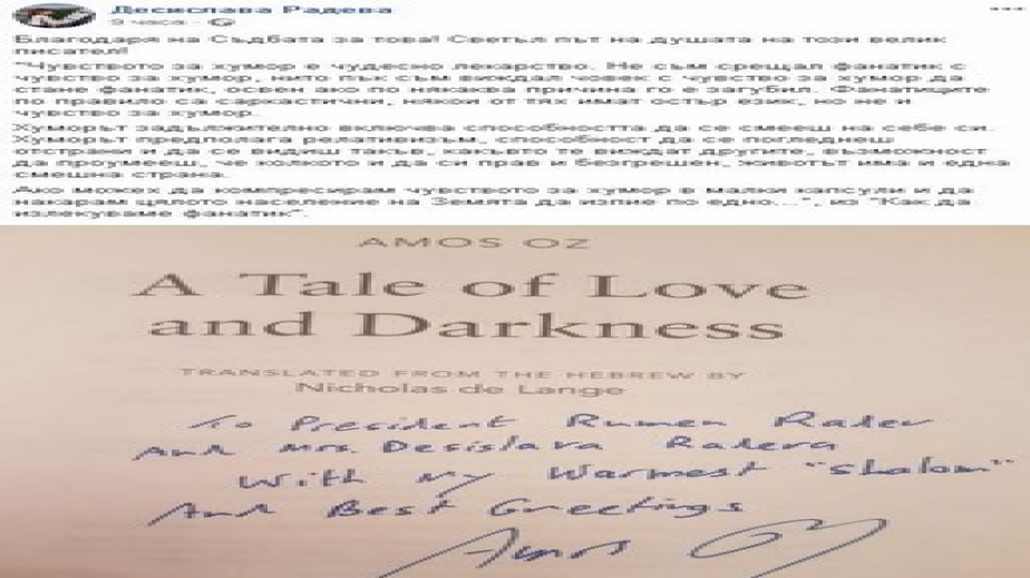 Освен това Г-жа Радева сподели и снимка от книгата „История за любов и мрак“ на Амос Оз, която е надписана специално от автора за президента и съпругата му.