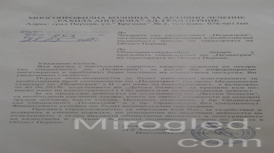 Той е водил многократни разговори с колеги педиатри, както от Пернишко, така и от цялата страна. Пускани са десетки обяви, че се набират лекари за детския сектор, коментирано е положението и с Министерството на здравеопазването. И всичко това с една единствена цел, детското отделение на „Рахила Ангелова“ да продължи да работи и да приема малки пациенти.
