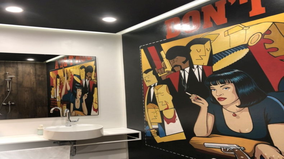 В банята Диляна се къпе до огромно изображение на Ума Търман от класиката "Криминале", предават от Уикенд.