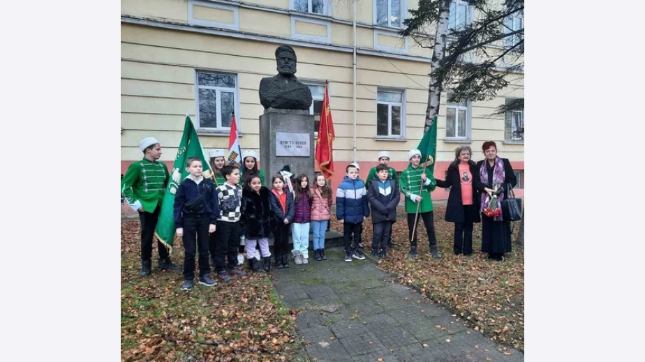Ученици от двете училища стояха на почетна стража пред паметника на поета-революционер и поднесоха цветя и венци.