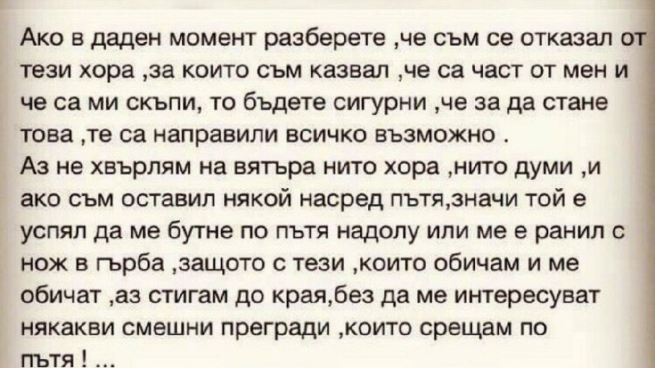 Точно в този смисъл са и последните много силни изповеди на Фолк идолът на 2016 година: „Ако в даден момент чуете, че се отказвам от хора, на които държа и са ми скъпи, то бъдете сигурни, че те са направили всичко възможно за това. Не хвърлям думи и хора на вятъра, освен ако не ми забият нож в гърба“- са само част от силните думи на звездата, повече от обръщението може да видите на снимката.