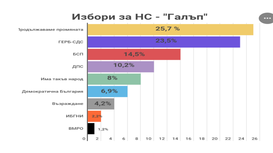 "Продължаваме промяната" печели изборите за парламент с 25,7%, по данни от екзит пол на "Галъп интернешънъл болкан" към 19.00 часа.