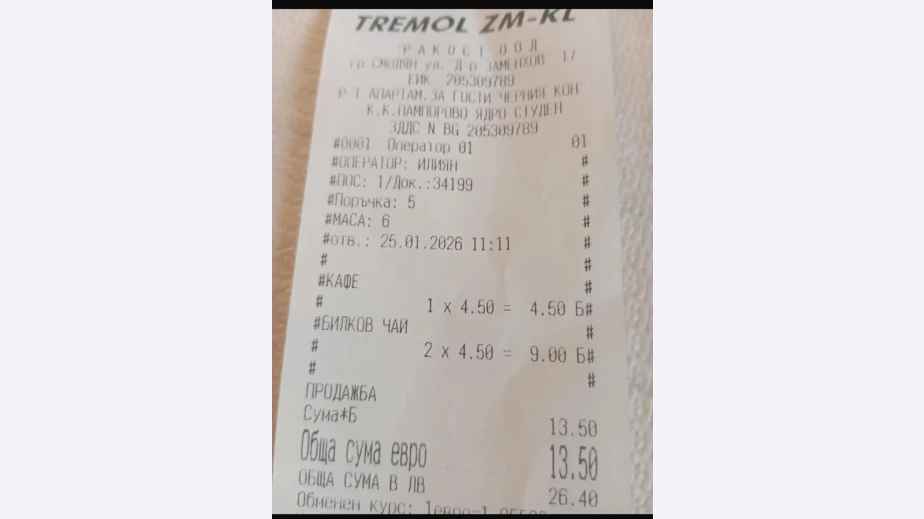 Съпругата на музиканта Цветелин Атанасов, познат като Цецо Елвиса, сподели снимка на касова бележка във Facebook, която предизвика възмущение. От нея става ясно, че нейни приятели са платили 4,50 евро за кафе и 4,50 евро за чай на Студенец в Пампорово.