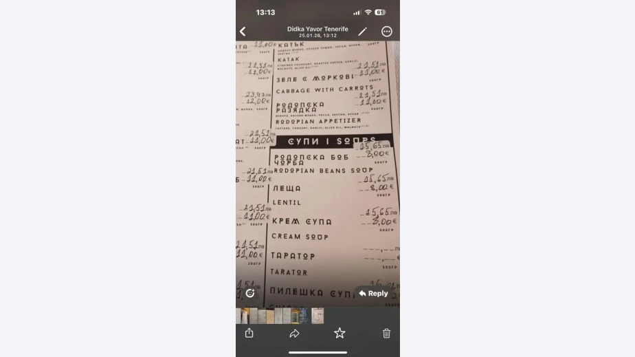 В коментарите Нейкова публикува и снимка от меню, на което се вижда, че супата струва 8 евро, а една обикновена салата от зеле и моркови - 11 евро.