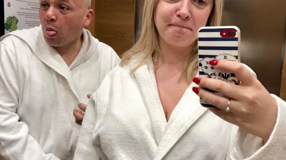 За да не е сама в друсането на телеса, Юлия пусна снимка на също добре закръгления си съпруг по хавлия.