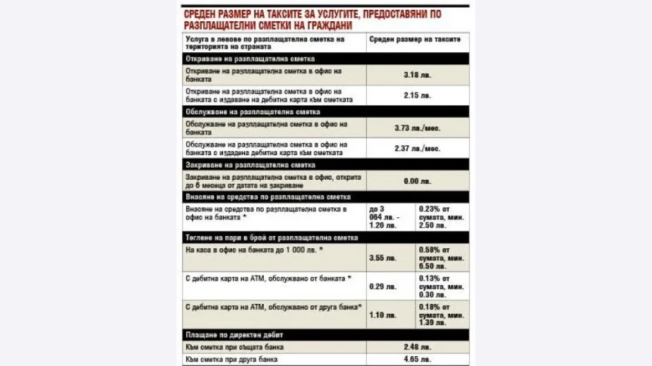 В изпълнение на това изискване БНБ ежегодно публикува средния размер на таксите, които събират банките в страната, а съответно таксите по платежните сметки за основни операции трябва да са под тези размери.