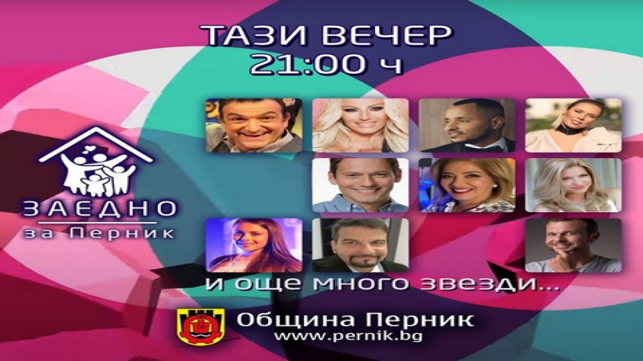 Онлайн концерта "ЗАЕДНО" е организиран от община Перник със съдействието на фондация „Богданова и Данаилова“, Ylicata.com, Сдружението на пернишките рок-музиканти и всичик артисти и изпълнители, без които благородното начинание не би могло да бъде възможно . Кои са останалите изпълнители ще научите днес в 21.00 ч. на Фейсбук страницата на община Перник. Всички те ще пеят за набиране на средства за закупуване на респиратор за МБАЛ „Рахила Ангелова“.