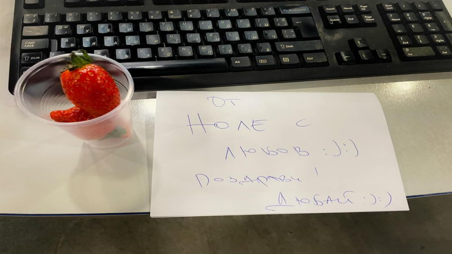 Натали Трифонова, която тази сутрин води прогнозата за времето по bTV показа любопитна снимка, на която се вижда чаша с няколко ягоди на бюрото й и мила бележка. По-интересното е, че и двете са оставени от нейния колега Петър Бакърджиев от спортния отдел на телевизията.