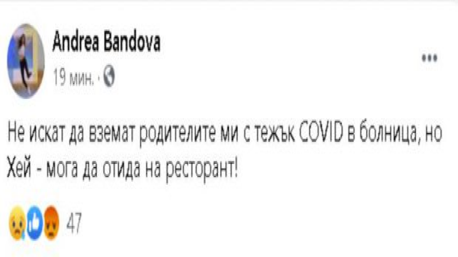 В действителност това е причината, става ясно от публикациите на инфлуенсърката в последно време. Днес тя го заяви и в прав текст, но след това бързо изтри поста си, който гласеше, че не искат да вземат родителите й в болница с тежък Covid, но затова пък можела да отиде на ресторант.