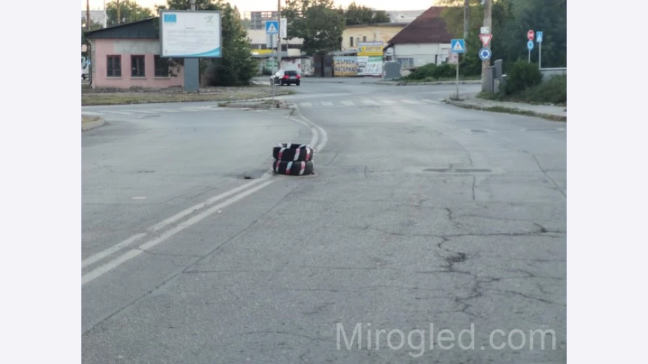 Дупка, зееща повече от две седмици на една от най-натоварените улици в Перник, е обезопасена с две гуми, около които е навита предупредителна лента. Иновативното решение е приложено на шосето, което минава покрай пазара.