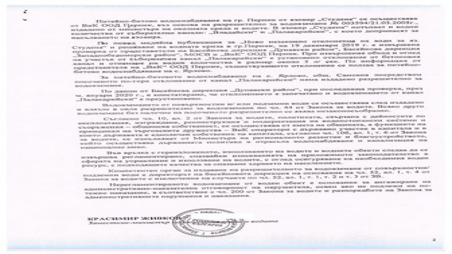 От писмото на зам.-министърът става ясно, още, че всяко нерегламентирано водовземане от воден обект е основание за административно наказание по Закона за водите, тъй като „ВиК“ операторите с държавно участие, каквото е пернишкото се ръководи от МОСВ, който осъществява държавата политика в отрасъла водоснабдяване и канализация на национално ниво.