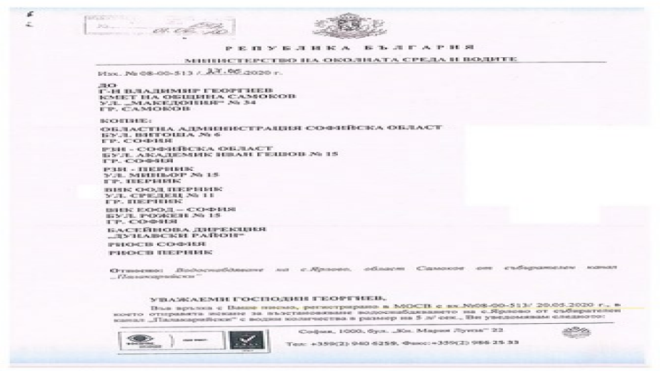 От приложените документи става ясно, че на 18 май 2020 г. Владимир Георгиев – кмет на община Самоков е поискал разрешение за ползване на 5л./сек. вода от язовир „Студена“ за жителите на с. Ярлово. От писмото става ясно, че още на 31.01.2020 г.поради критично ниско ниво на пернишкия язовир, крана е бил прекъснат и водоподаването към селото от този водоизточник е спряно. Въпреки това кмета на общината е поискал отново да му бъде разрешено ползването на вода от Палакарийския Воден Канал към с. Ярлово.