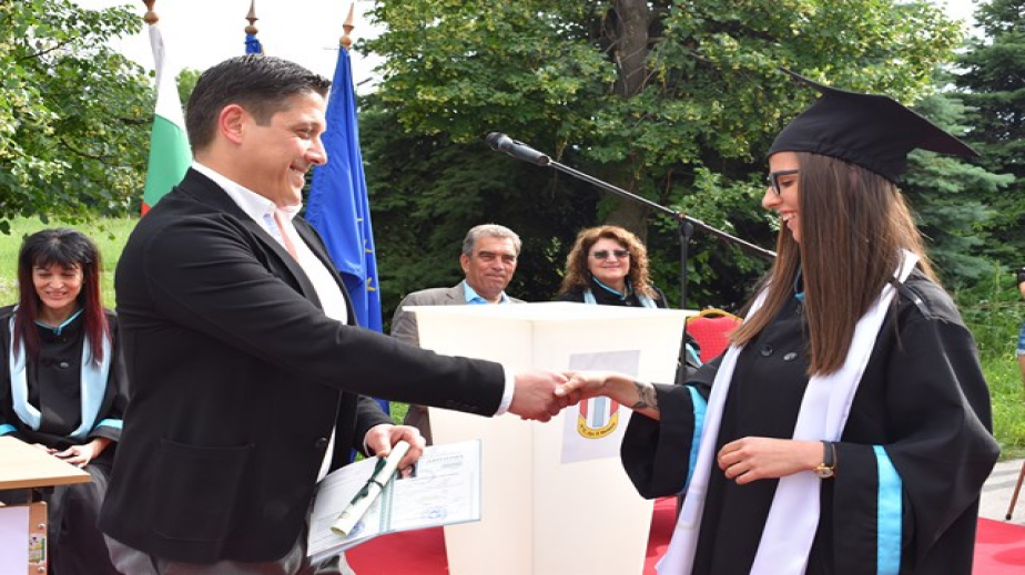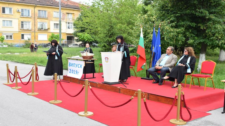 Абитуриентите от ПГТС „Арх. Йордан Миланов" получиха дипломите си за завършено средно образование на стилна церемония в двора на учебното заведение. Дванадесетокласниците и целият преподавателски състав бяха облечени в тоги и шапки.