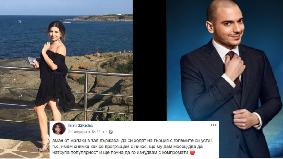 „Аман от „малаки” в тая държава. Да си ходят на Гърция с големите си усти! П.С. имам снимка как се прегръщам с Никос. Ще му дам месец-два да натрупа популярност и ще почна да го изнудвам с компромати”, пише тя в социалните мрежи.
