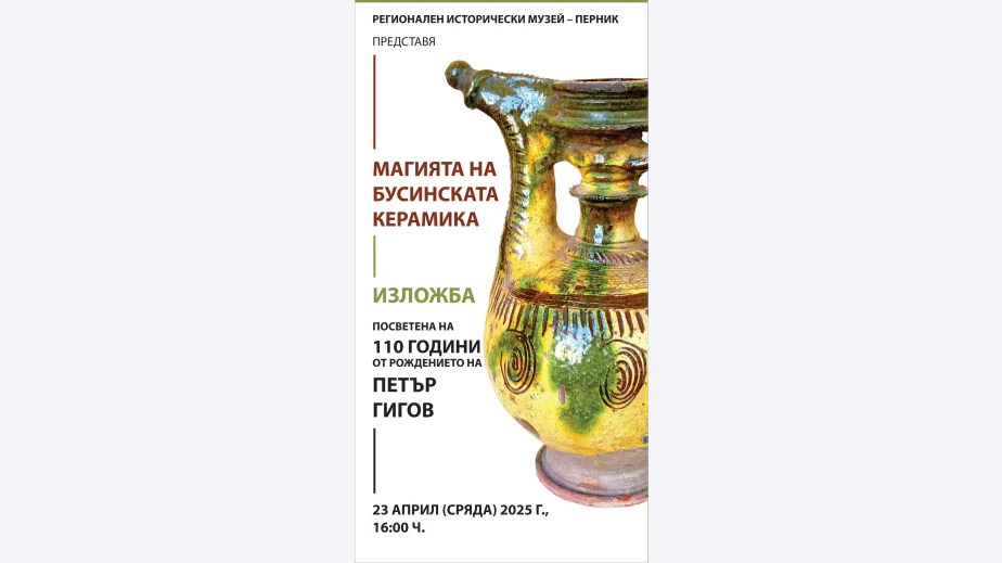 Изложба „Магията на бусинската керамика“ ще бъде открита 23 април от 16:00 часа в Регионаления исторически музей-Перник, съобщават от културната институция.