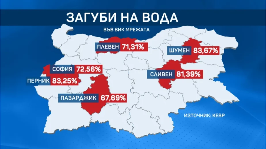 Най-големи са загубите през изминалата година в областите Перник и Шумен - над 83%. В челната петица по водни загуби влизат и областите - Сливен с 81,39%, София област и Пазарджик. Плевен, където водният режим продължи месеци, над 71% от подадената вода в областта се губи по мрежата, отчита комисията регулатор, съобщават btvnovinite.bg