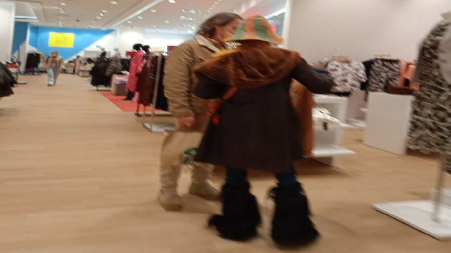 Калина беше дегизирана с космата шапка идиотка в няколко цвята. С подобни, но не маркови, обикалят и столичните клошари, както и хора в деликатно състояние. Въпреки че беше в магазин и нямаше слънце, царската наследница не се разделяше със слънчевите си очила, скривайки разкривените си очи, които вече са с видоизменена форма от N на брой корекции. Шареният шал и палтото в зелено и кафяво се допълваха от оранжева чанта, черен панталон и кукерски космати ботуши, сякаш заети от участник във фестивала „Сурва”, пише в."Уикенд".