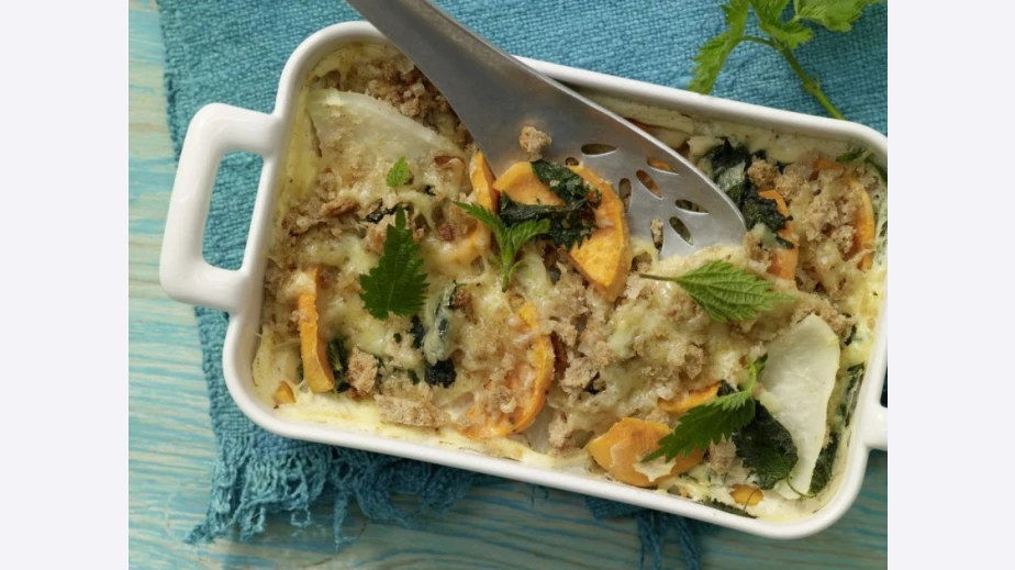 Смесват се с копривата и се разстила в тавичка.