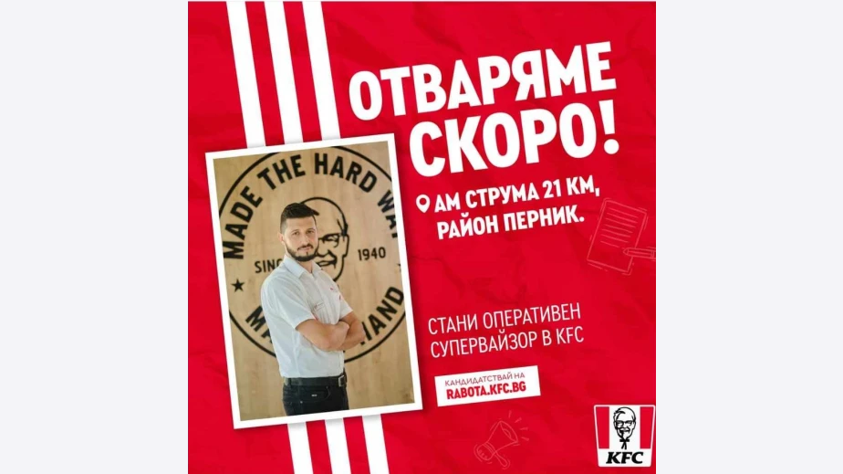 Американската верига ресторанти за бързо хранене KFS отваря врати в район Перник.Предпочитаното място за хапване от милиони хора по света отваря своя първи ресторант на 21-я км ., от магистрала Струма в район Перник.