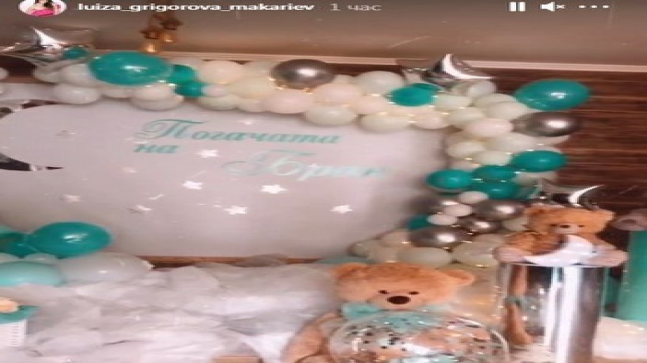 За празника тя избра много ефектна украса с плюшени мечоци, балони и панделки в бяло и зелено. Върху сладките за почерпката бе изписано името на Бран./Източник: Лупа.бг