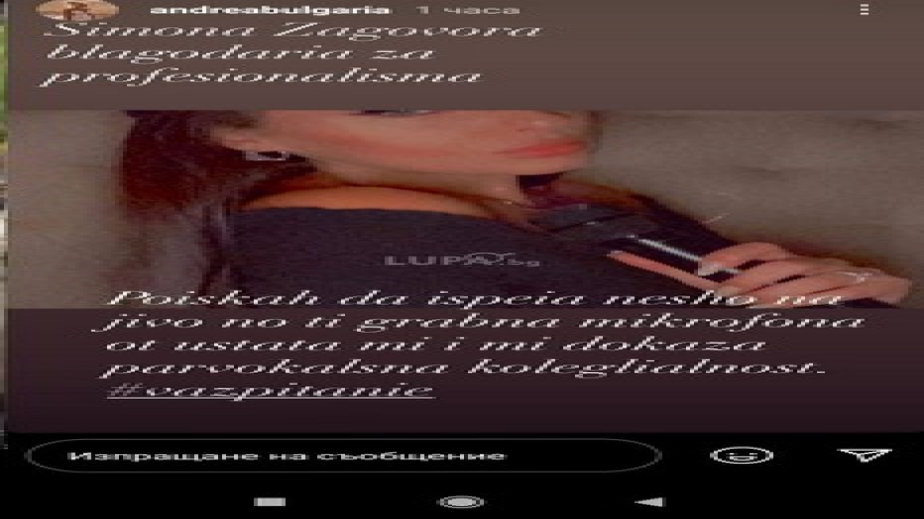 "Симона Загорова, благодаря за професионализма. Поисках да иСпея нещо на живо, но ти грабна микрофона от устата ми и ми доказа първокласна колегиалност #възпитание" - допълни сапаревобанската блондинка, която не счита за нужно да използва запетайки, които Lupa.bg допълни в изреченията на русата певица.
