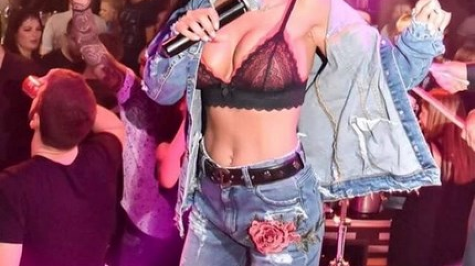 В града под тепетата фолкпевицата излезе на сцената с полупрозрачен сутиен, който едва придържаше пищната й силиконова гръд. Бельото беше полупрозрачно и повече показваше, отколкото да прикрива зърната на прясно необвързаната изпълнителка.