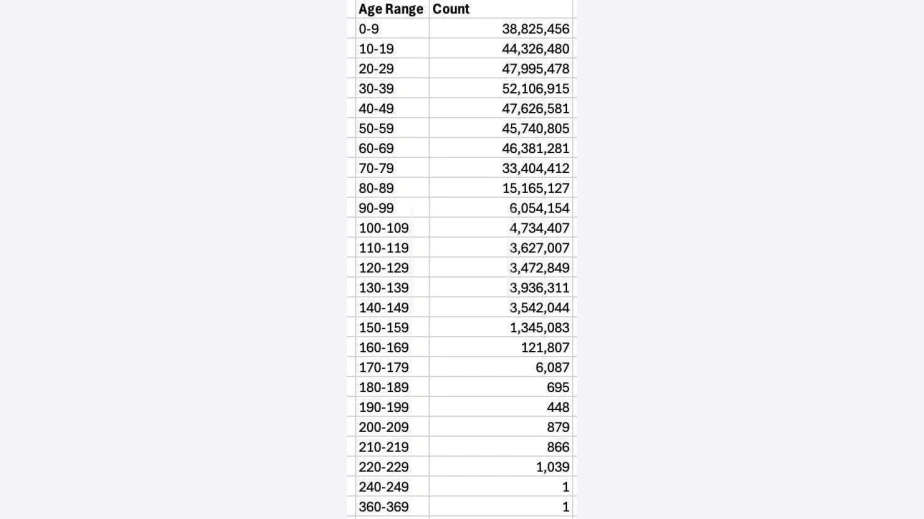 Според тази таблица сред получаващите обезщетения в САЩ "живеят" не само няколко милиона души на възраст между 120 и 249 години, но и един "дълголетник", който попада във възрастовата категория 360-369 години.