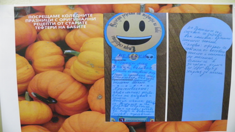 Децата истински се забавляваха и се включиха сърцато в писането на коледни картички,предоставени от библиотеката, както и в направата на коледни сувенири. По- големите имаха за задача да издирят рецепти от тефтерите на баба. Интересни идеи за коледни сладкиши бяха изписани на книгоразделители– коледни бисквитки, коледни гевречета, негърка, коледен кейк, разказва Албена Савова, преподавател в училището.
