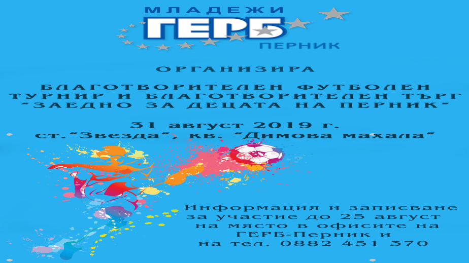 Футболът не е просто игра. Той е стремеж към благородство, създаващ колективи, учещ на дисциплина, индикатор за добро и обединяващ хиляди сърца и души в едно. През годините сме ставали свидетели на различни каузи , около които се е обединила футболната общественост. В ритъма на тази велика игра, ние от МГЕРБ – Перник решихме да отбележим Международния ден на младежта, като организираме благотворителен турнир по футбол в помощ на детското отделение на МБАЛ „Рахила Ангелова”-гр. Перник.