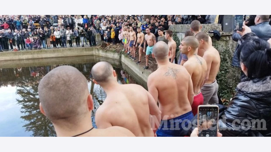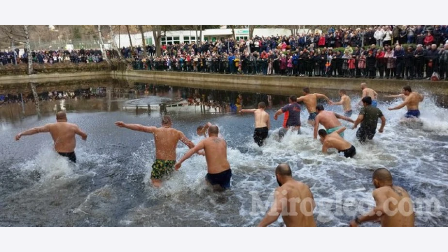 17 мъже се хвърлиха в студените води на езерото в градския парк днес преди обяд, стотици бяха хората дошли да видят традиционния ритуал в днешния топъл януарски ден.