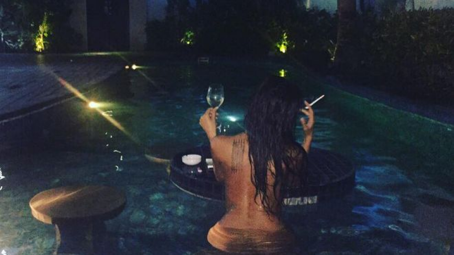 Красавицата позира в гръб в басейн, в който е седнала на едно столче, а в ръцете си държи цигара и чаша с шампанско. Кадрите са остров Бали, където Валериева е на почивка със своя приятелка.