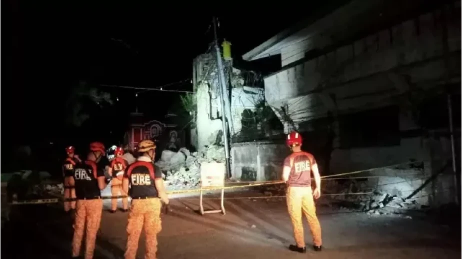 Драматични кадри, заснети от жители и широко разпространени в социалните мрежи, показват стара католическа църква на остров Бантаян близо до Себу, украсена с верига от електрически крушки, които се люлеят, малко преди камбанарията ѝ да се срути в двора.
