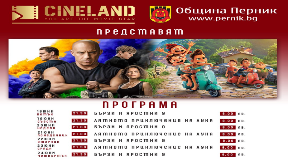 Прожекции на най-хитовите и актуални филми се завръщат на екрана в лятно кино CineLand Перник. Още този петък /18 юни/ любителите на седмото изкуство ще могат да съпреживеят емоцията и да вдигнат адреналина си с героите от деветата част на хитовата екшън поредица „Бързи и яростни“ Световният феномен „Бързи и яростни“ се завръща на големия екран с най-мащабното, експлозивно и вълнуващо приключение в поредицата до момента – „Бързи и яростни 9“. 20 години след дебюта на първата част, семейството на Доминик Торето се събира отново, за да се изправи пред най-страховития си противник до момента – братът на Дом Джейкъб (Джон Сина, Бъмбълби). Експлозивен екшън, емоционална история и много забавление, „Бързи и яростни 9“ ще предложи на зрителите изживяване, което не бива да пропускат на голям екран.