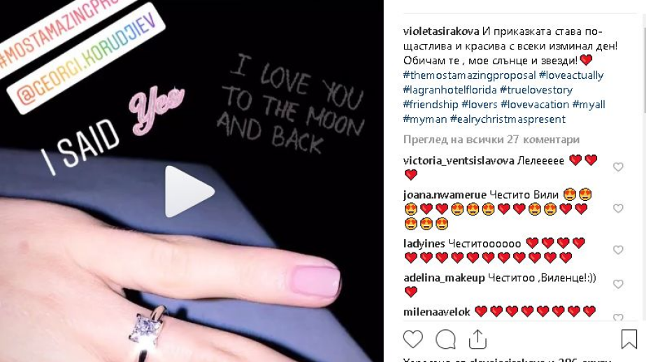 „Приказката става все по-щастлива и красива с всеки изминал ден! Обичам те, мое слънце и звезди”, написа Виолета, след като показа пръстените.