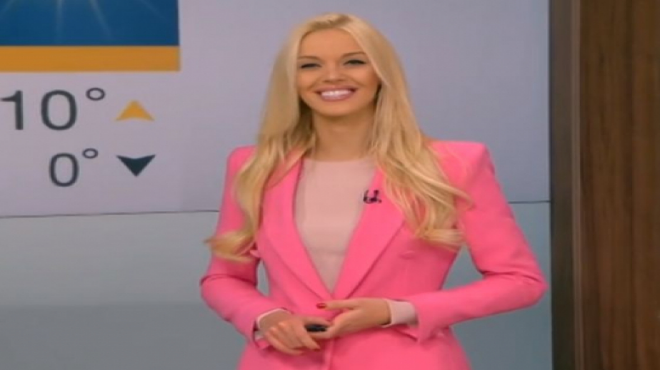 Комбинацията от бонбоненото костюмче и ярко русата грива доближиха визията на красивата синоптичка максимално до тази на прочутата кукла Барби.