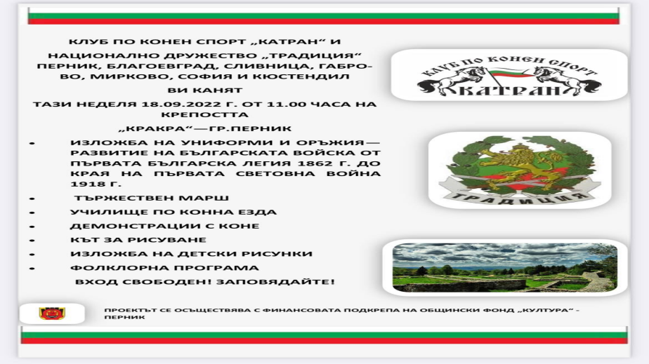 ТАЗИ НЕДЕЛЯ /18.09.2022 Г./ ОТ 11,00 ЧАСА НА КРЕПОСТТА „КРАКРА“ ЩЕ СЕ ПРОВЕДЕ СЪВМЕСТНО МЕРОПРИЯТИЕ НА КЛУБ ПО КОНЕН СПОРТ „КАТРАН“, КВ.ЦЪРКВА И НАЦИОНАЛНО ДРУЖЕСТВО „ТРАДИЦИЯ“ КЛОН ПЕРНИК, БЛАГОЕВГРАД, СЛИВНИЦА, ГАБРОВО, МИРКОВО, СОФИЯ И КЮСТЕНДИЛ. ПРОГРАМАТА ПРЕДВИЖДА: - ИЗЛОЖБА НА УНИФОРМИ И ОРЪЖИЯ—РАЗВИТИЕ НА БЪЛГАРСКАТА ВОЙСКА ОТ ПЪРВАТА БЪЛГАРСКА ЛЕГИЯ 1862 Г. ДО КРАЯ НА ПЪРВАТА СВЕТОВНА ВОЙНА 1918 Г.; - ТЪРЖЕСТВЕН МАРШ; - УЧИЛИЩЕ ПО КОННА ЕЗДА; - ДЕМОНСТРАЦИИ С КОНЕ; - КЪТ ЗА РИСУВАНЕ ЗА НАЙ-МАЛКИТЕ; - ИЗЛОЖБА НА ДЕТСКИ РИСУНКИ; - ФОЛКЛОРНА ПРОГРАМА И ОЩЕ МНОГО ИЗНЕНАДИ. ВХОД СВОБОДЕН! ЗАПОВЯДАЙТЕ!